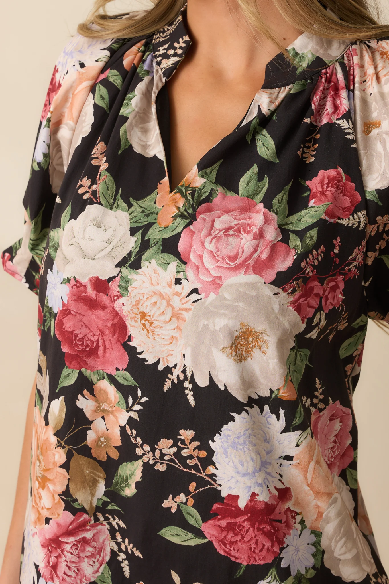 This black multi floral print cotton mini dress is full of charm, perfect for those days when you want to go somewhere new and memorable. It has a pink multicolor floral pattern, a split v-neck, short puff sleeves with elastic ruffled cuffs, side seam pockets, and a straight shift style.