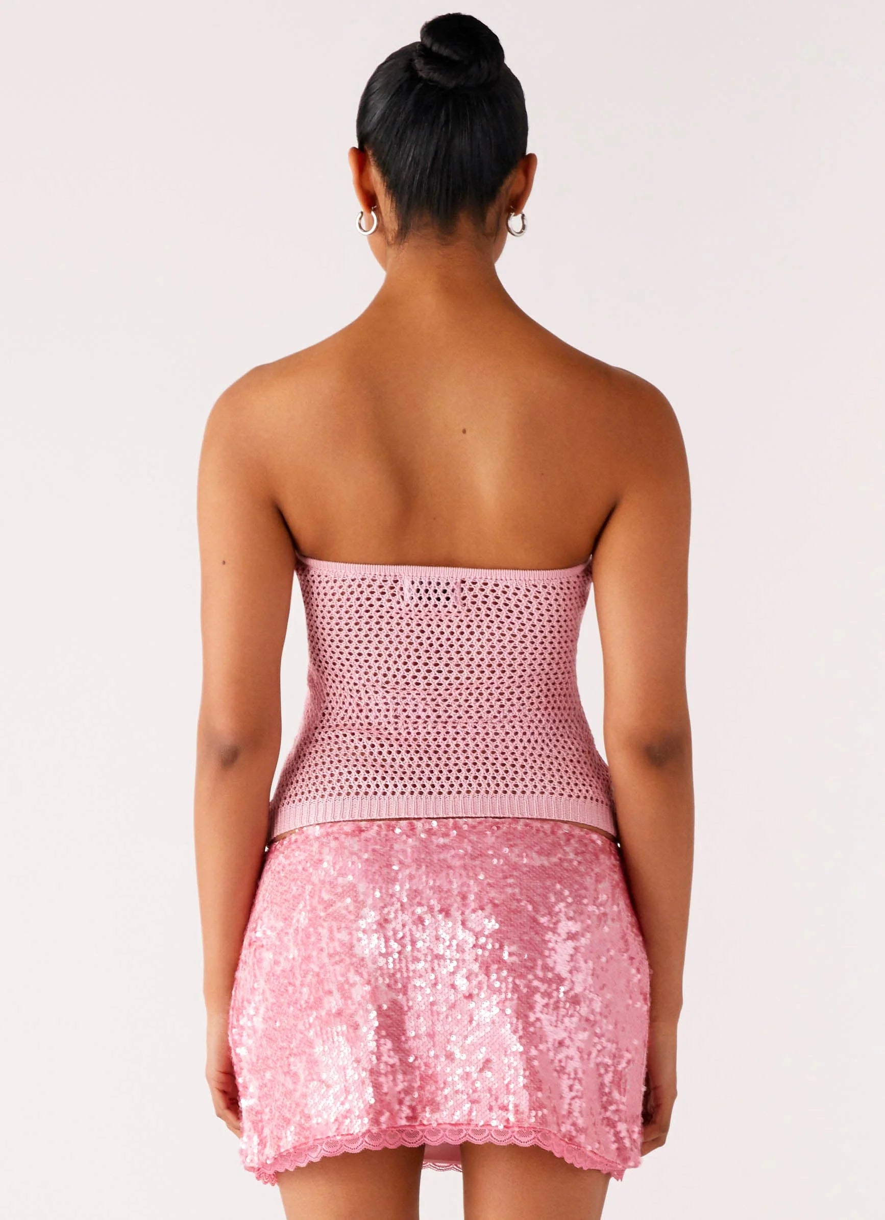The Galia Crochet Top is your new PM staple, blending playful charm with a bold silhouette. Featuring a strapless neckline and keyhole cutout, it's crafted from semi sheer stretch knit with a statement flower embellishment at the bust. Perfect for nights that turn into mornings.