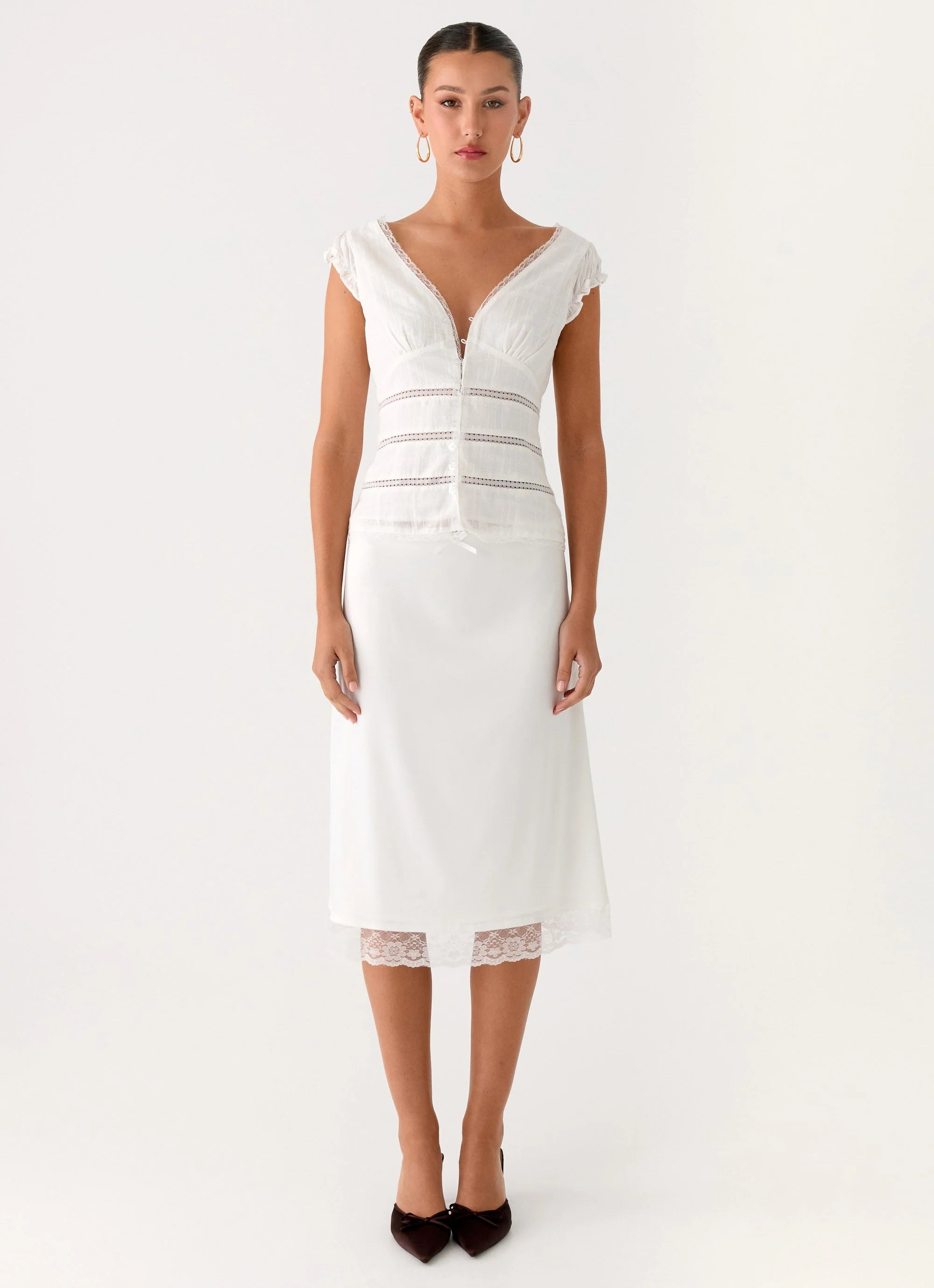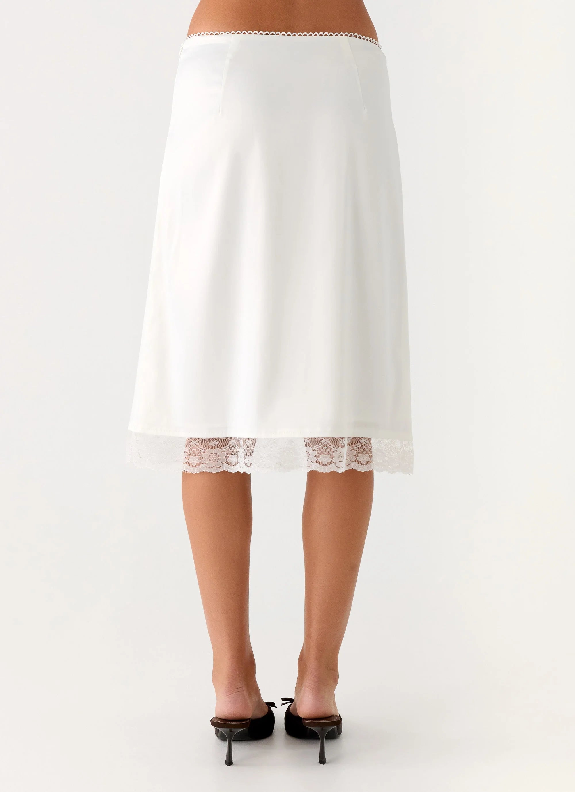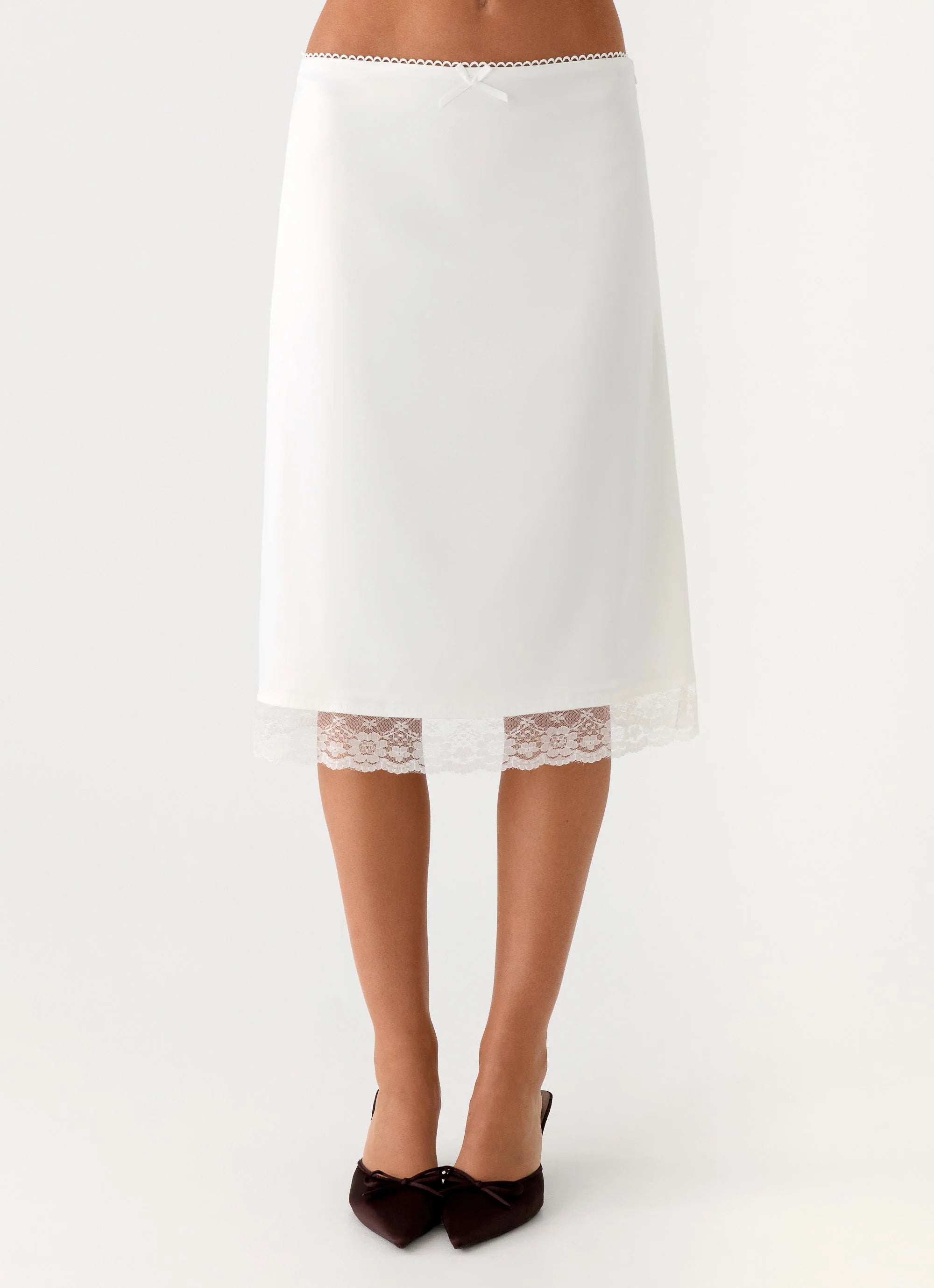 The Rina Low Rise Satin Midi Skirt is designed for nights that call for effortless elegance. Sitting low on the waist, it’s detailed with delicate lace trim along the waistline and hemline for a feminine touch. Fully lined with a sleek midi length silhouette, this satin piece is made to move with you from sunset drinks to after-dark plans.